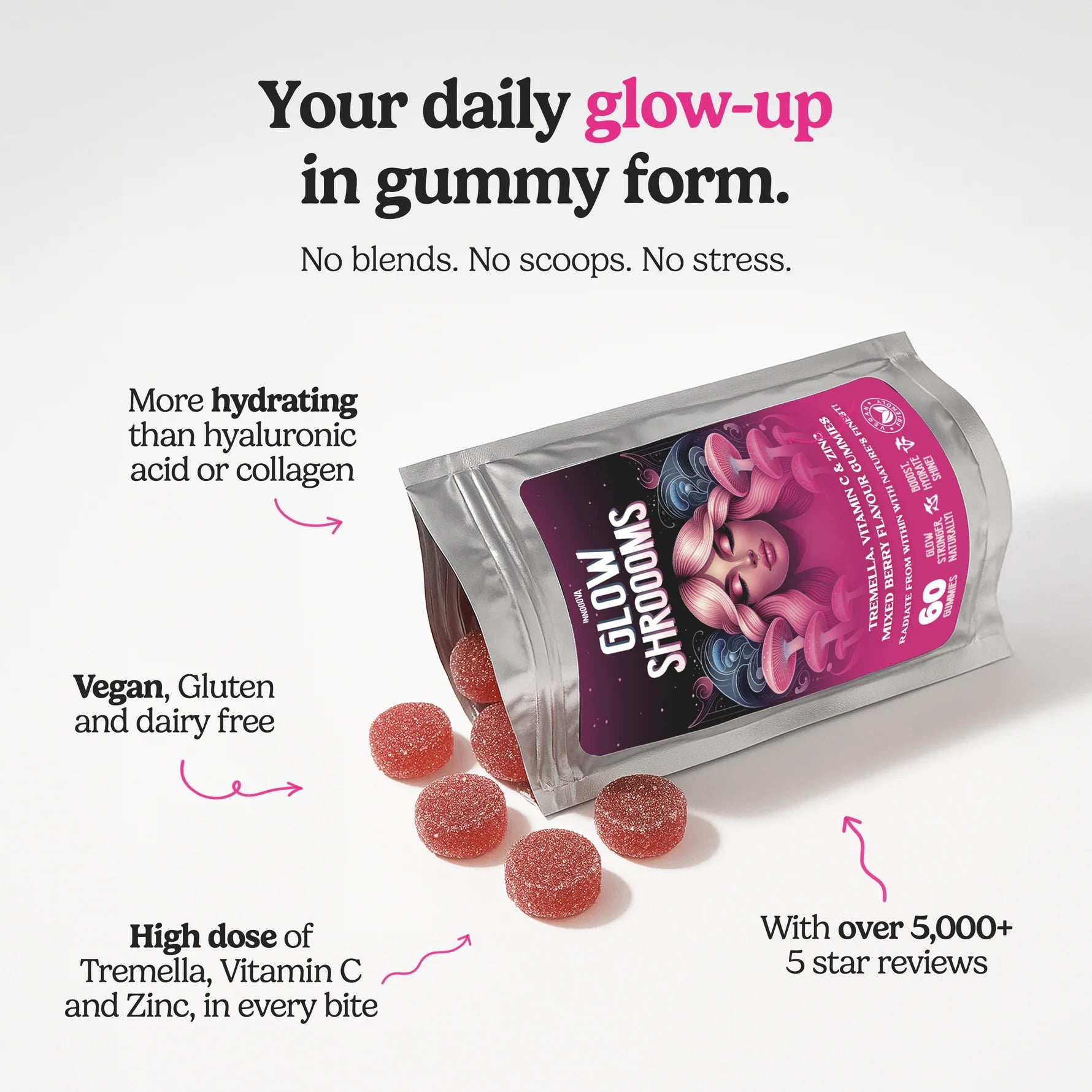 Boost your immune system and support healthy skin with Innooova's Glow Shroom Gummies Pack of 10. Packed with tremelia, vitamin c, and zinc, these gummies provide essential nutrients for a radiant glow and improved overall health. Expertly formulated to nourish and protect your body.