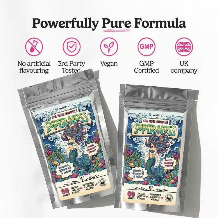 Innooova's Super Moss Sea Moss Gummies Pack of 60 provides a powerful blend of vitamins and minerals including vitamin C, vitamin D3, and iodine. These gummies offer essential nutrients that support overall health and wellness. Expertly crafted and scientifically formulated, Innooova's gummies are a convenient and effective way to supplement your daily diet.